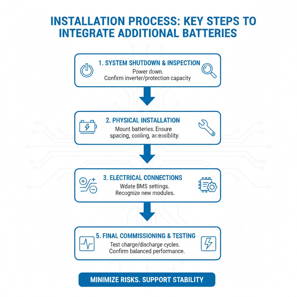 Integrating additional batteries into an existing battery bank follows a structured process. First, the system should be powered down and inspected to confirm available capacity on the inverter and protection devices. Physical installation comes next, with batteries mounted according to spacing and orientation guidelines to ensure adequate cooling and accessibility. Electrical connections are then added in parallel or series as specified, followed by configuration of the BMS to recognize the new modules. Final commissioning includes testing charge and discharge cycles to confirm balanced performance. Adhering to these steps minimizes installation risks and supports long-term system stability.