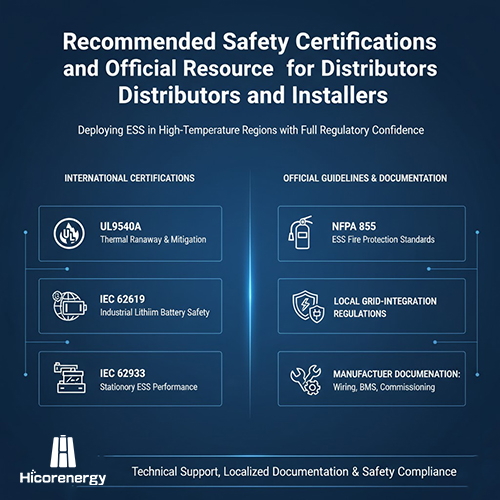 Hicorenergy’s LFP-based energy storage solutions deliver stable, safe performance in high-temperature environments, supported by advanced cooling, robust BMS protection, and reliable global certifications—making them ideal for distributors and installers in hot climates.