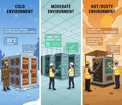 Environmental conditions significantly influence system efficiency, performance, and longevity. Temperature fluctuations are among the most critical factors, as extreme heat or cold can reduce battery capacity and accelerate degradation. Hicorenergy’s product lineup—including the I-BOX 48100R, C5°, Si LV1, SHV48100, and Si Station series—is engineered with wide operating temperature ranges, advanced BMS protection, and optional heating systems for cold environments. These systems maintain high efficiency even in challenging climates, making correct site selection essential to maximizing their capabilities. Installers should choose locations with stable temperatures, low humidity, and minimal dust to ensure reliable operation across residential, commercial, and industrial environments.